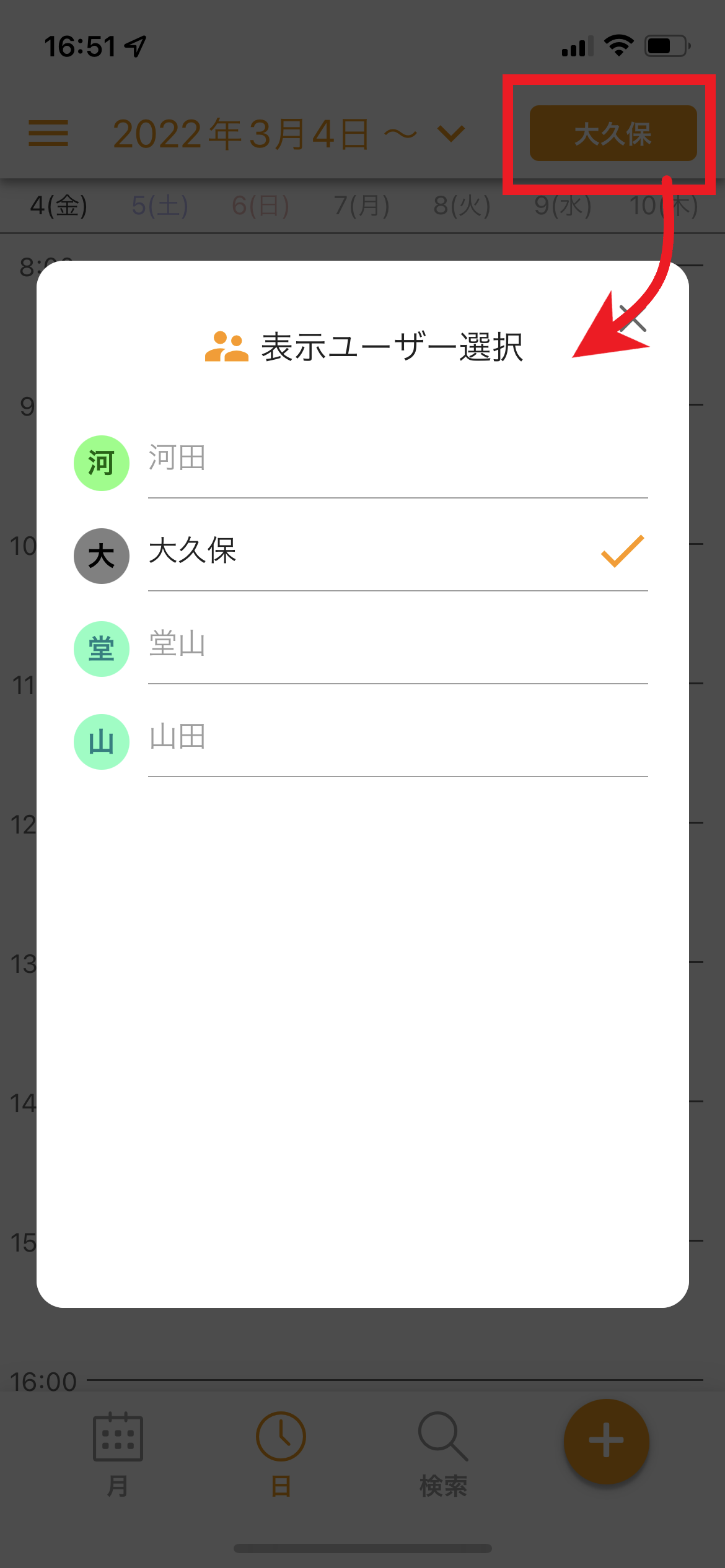右上のメンバーボタンをタップすると、カレンダーを表示するメンバーを切り替えることが出来ます。